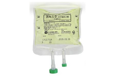 - 노란색의 투명한 액이 무색투명한 수액용 플라스틱 용기에 충전된 주사제